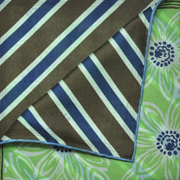 Flowers & Stripes Reversible Panama Silk Pocket Square in Green, Navy Blue & Brown