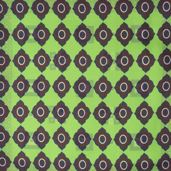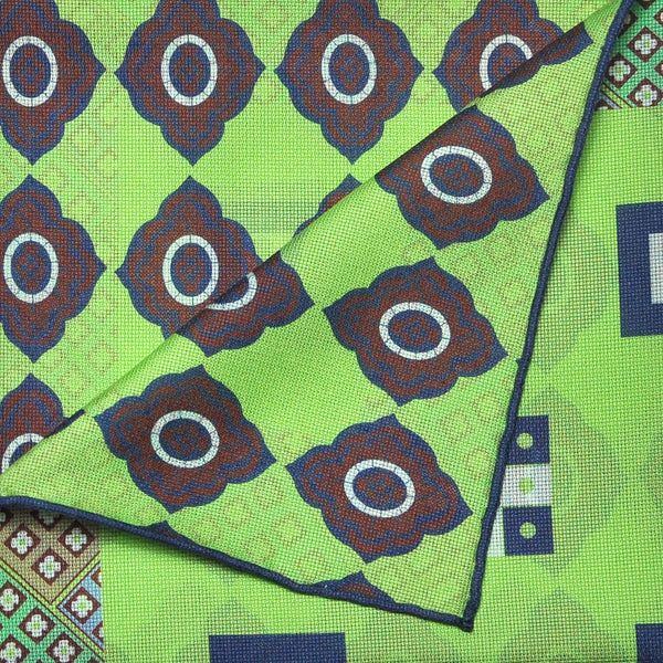 Geo's & Medallions & Florets Reversible Panama Silk Pocket Square in Lime, Brown & Blue