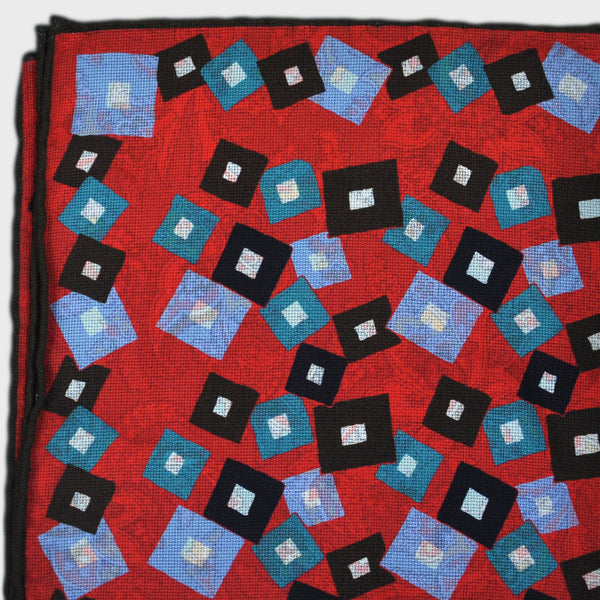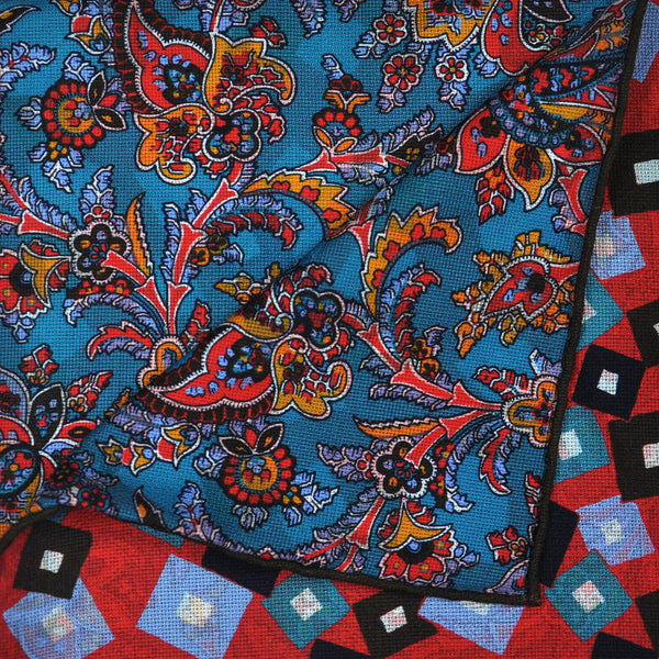Geo's & Paisley Reversible Panama Silk Pocket Square in Reds & Blues