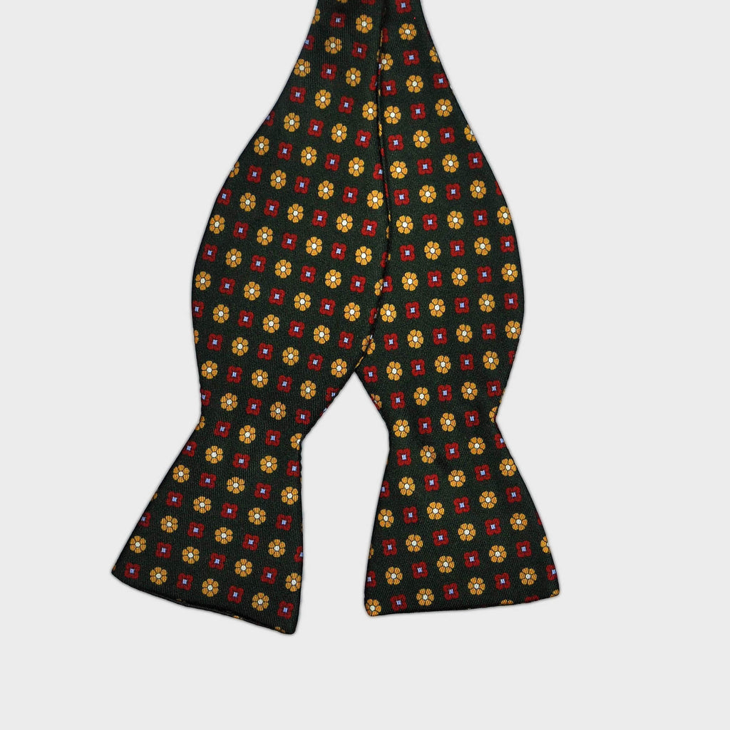 English Printed Silk Little Flowers Repeat Bow Tie in Bottle Green, Red & Yellow