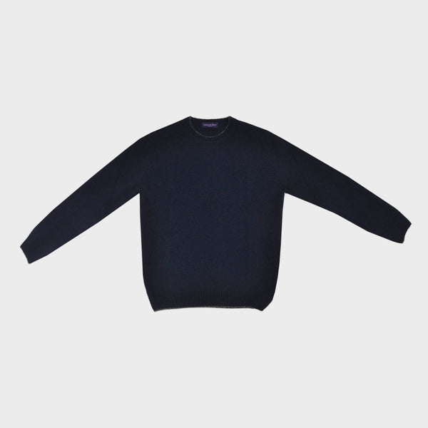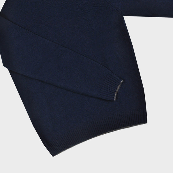 Merino Wool Crew Neck Jumper in Navy with Brown Trim