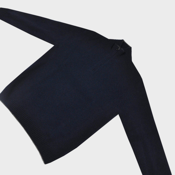 Merino Wool Quarter Zip Jumper in Navy with Light Brown Trim