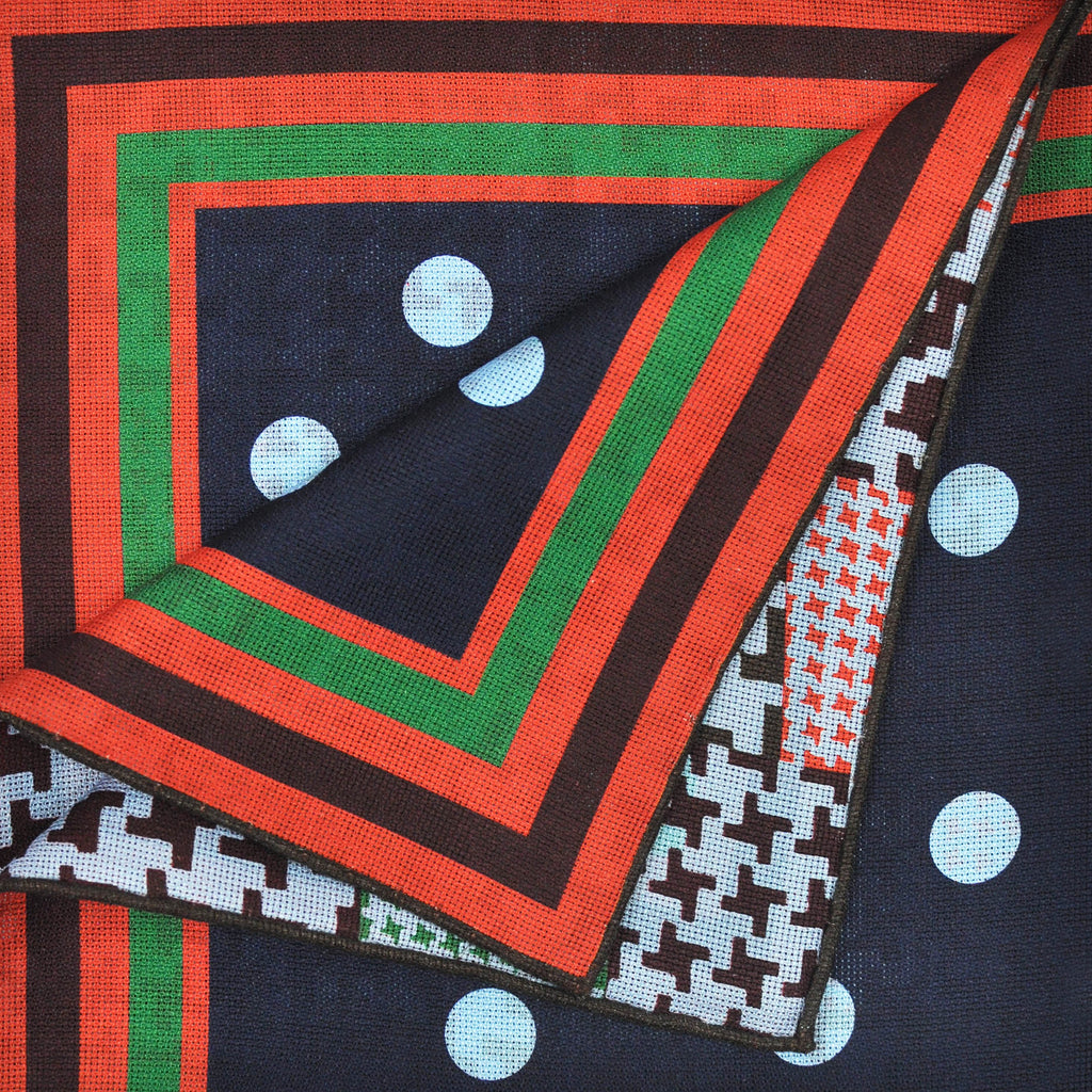 Medallions Reversible Panama Silk Pocket Square in Navy, White, Blue & Orange