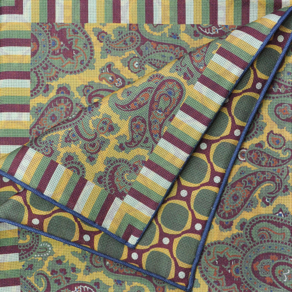 Stripes & Geometrics Wool & Silk Pocket Square in Claret, Ochre & Green