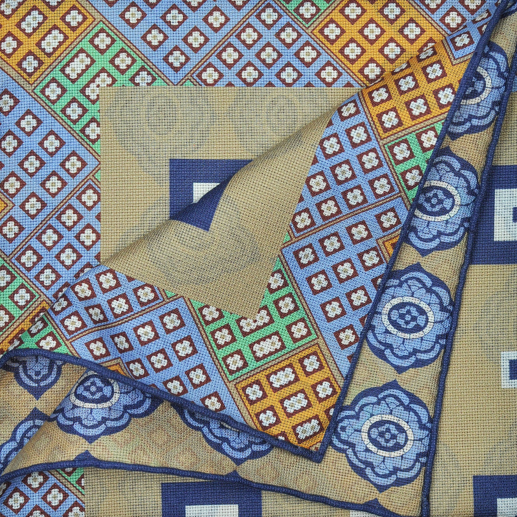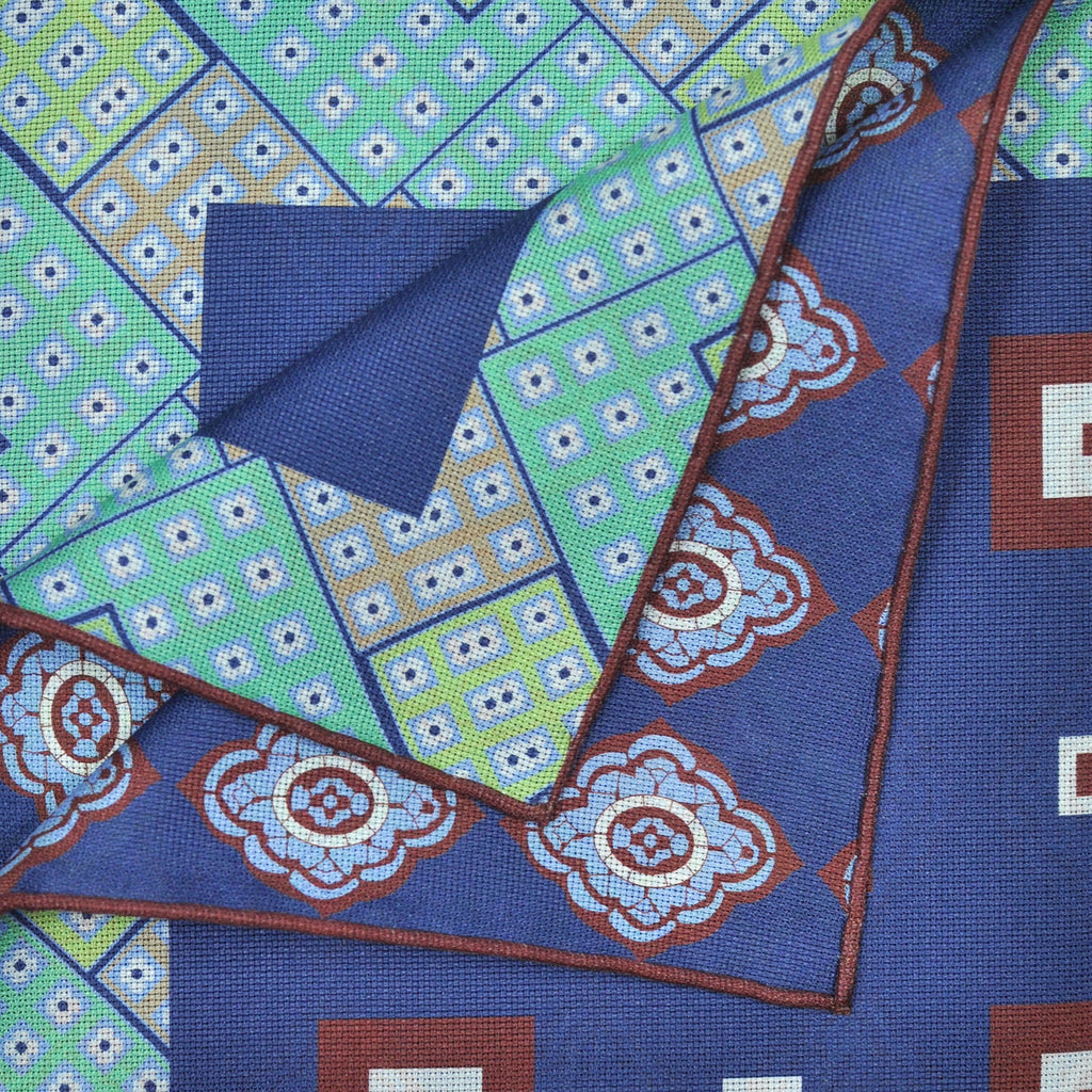 Geo's & Medallions & Florets Reversible Panama Silk Pocket Square in Blue & Brown & Pistachio