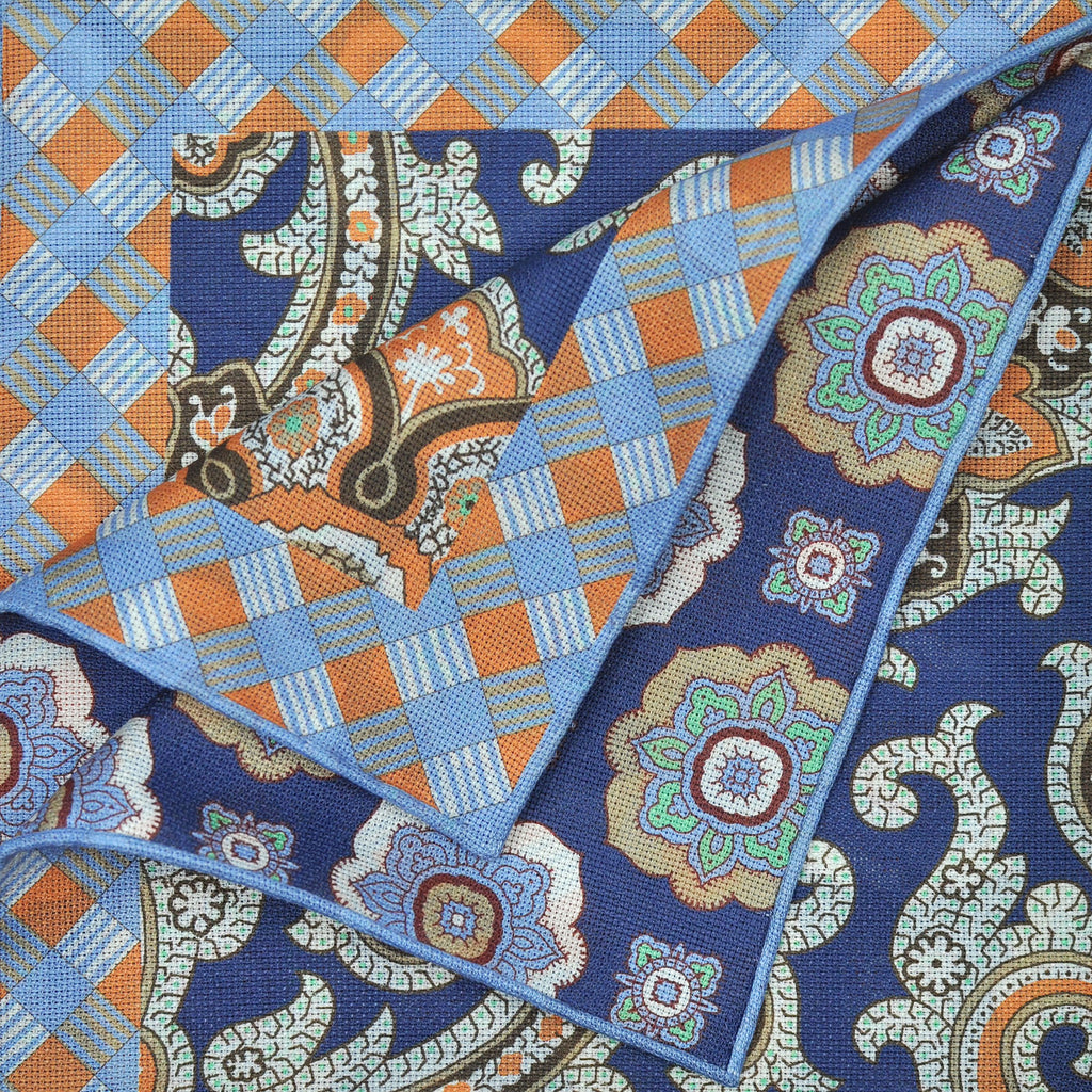 Paisley & Florets Reversible Panama Silk Pocket Square in Navy & Blue & Orange