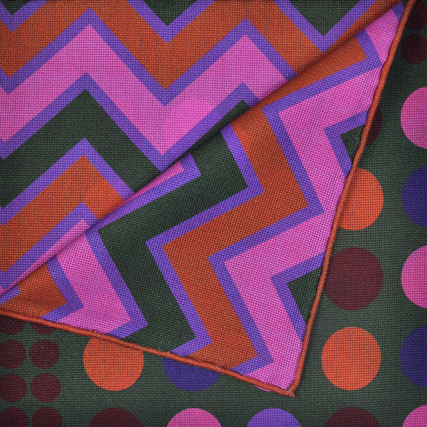 Dots & Zig Zags Reversible Panama Silk Pocket Square Green, Claret, Pink & Orange