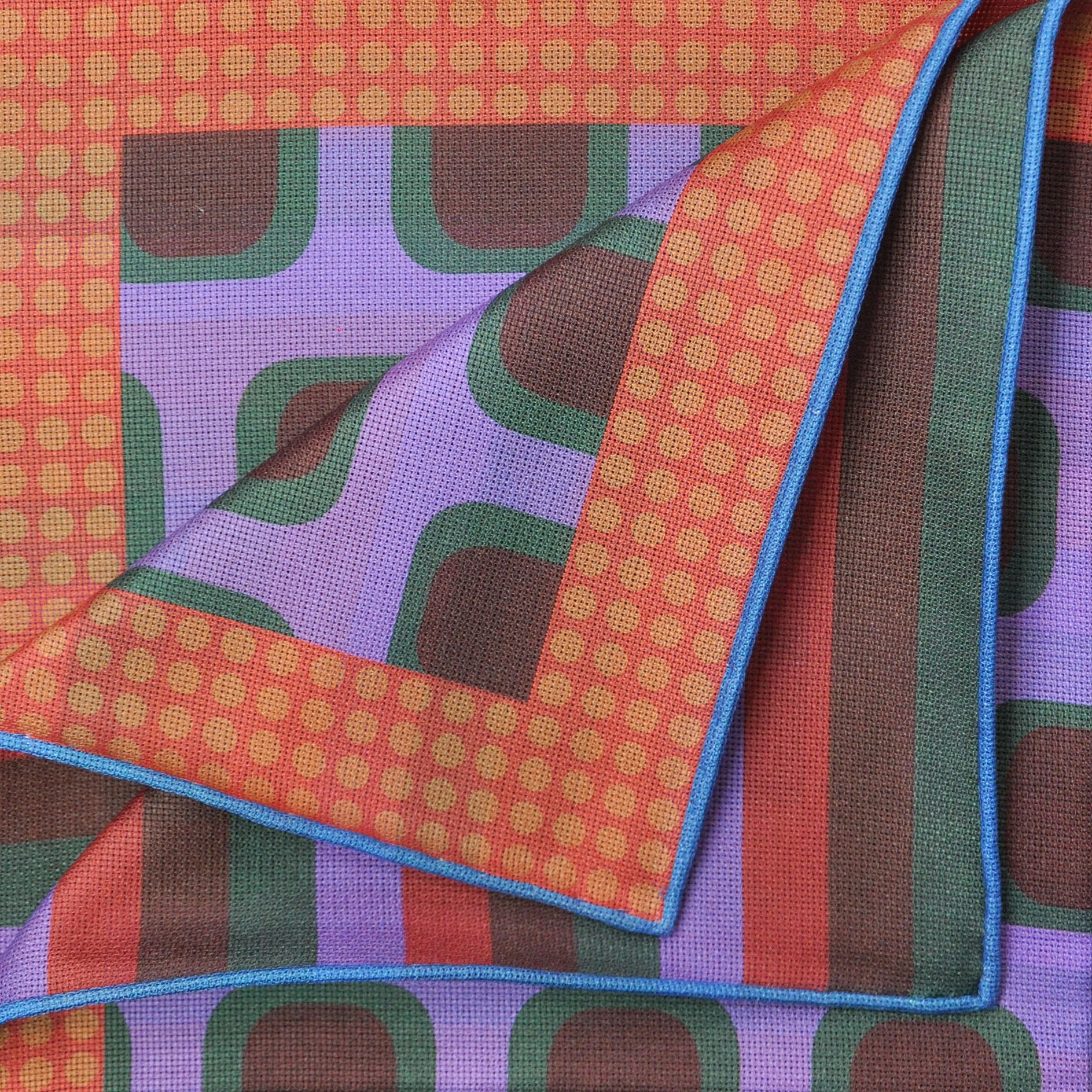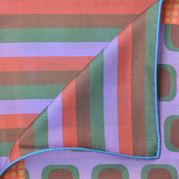 Dots, Geo's & Stripes Reversible Panama Silk Pocket Square in Violet, Brown & Orange
