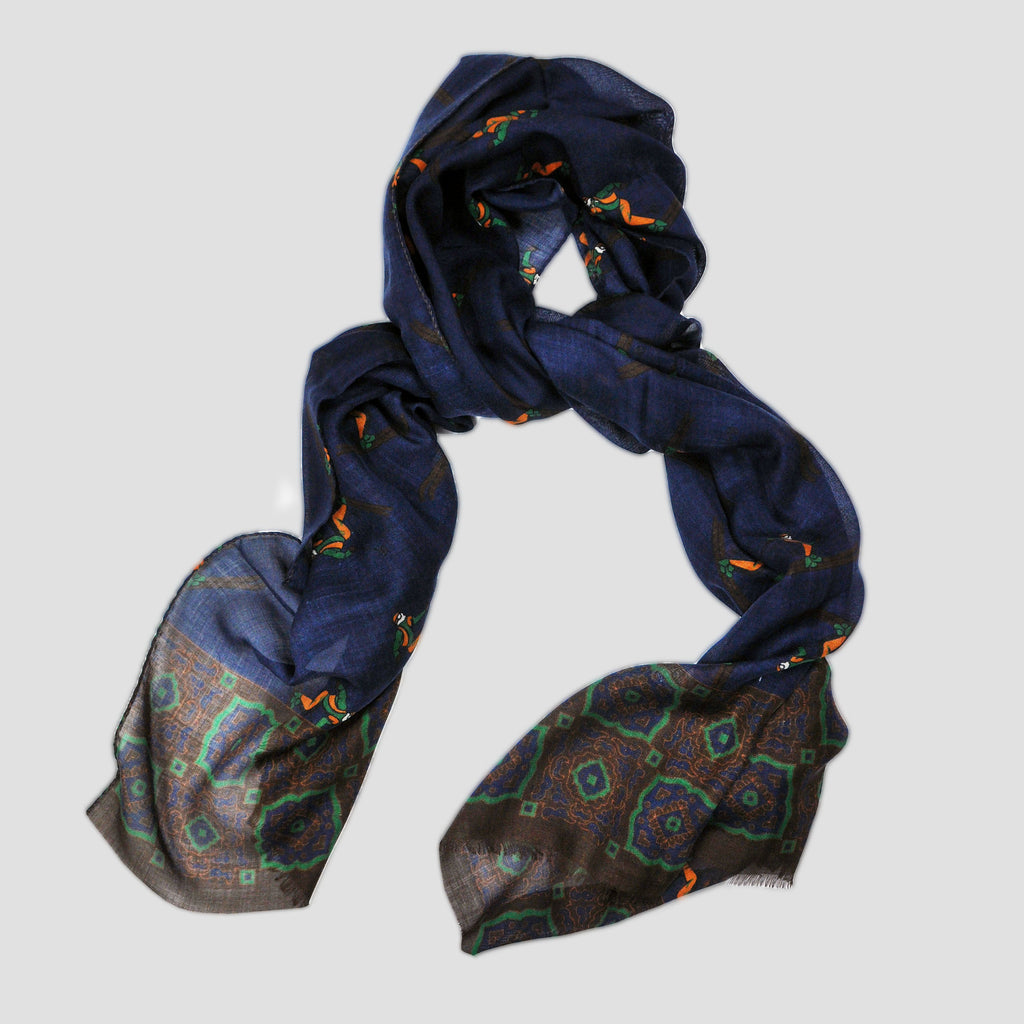 Wool Silk Mosaic of Medallions Scarf in Blue, Ochre, Green & Brown