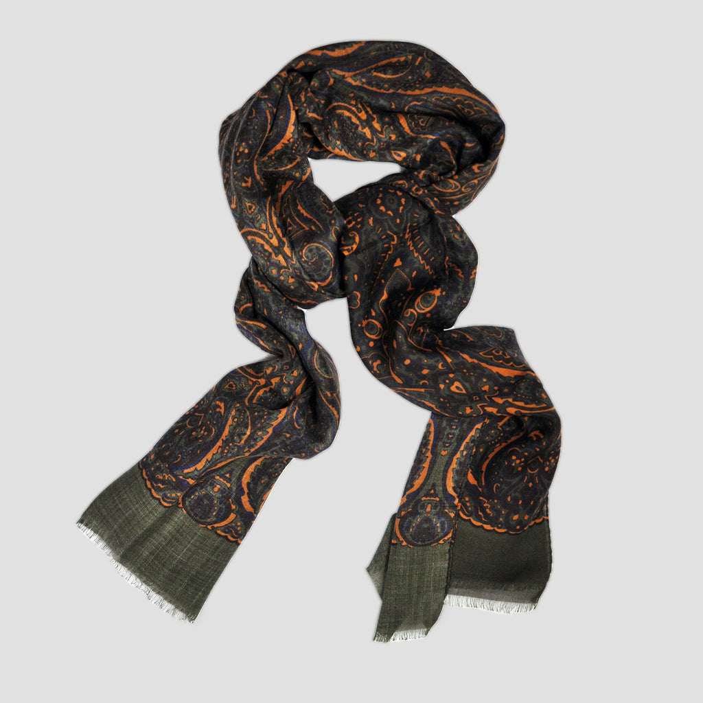 Wool Silk Paisley Scarf in Olive, Ochre & Brown