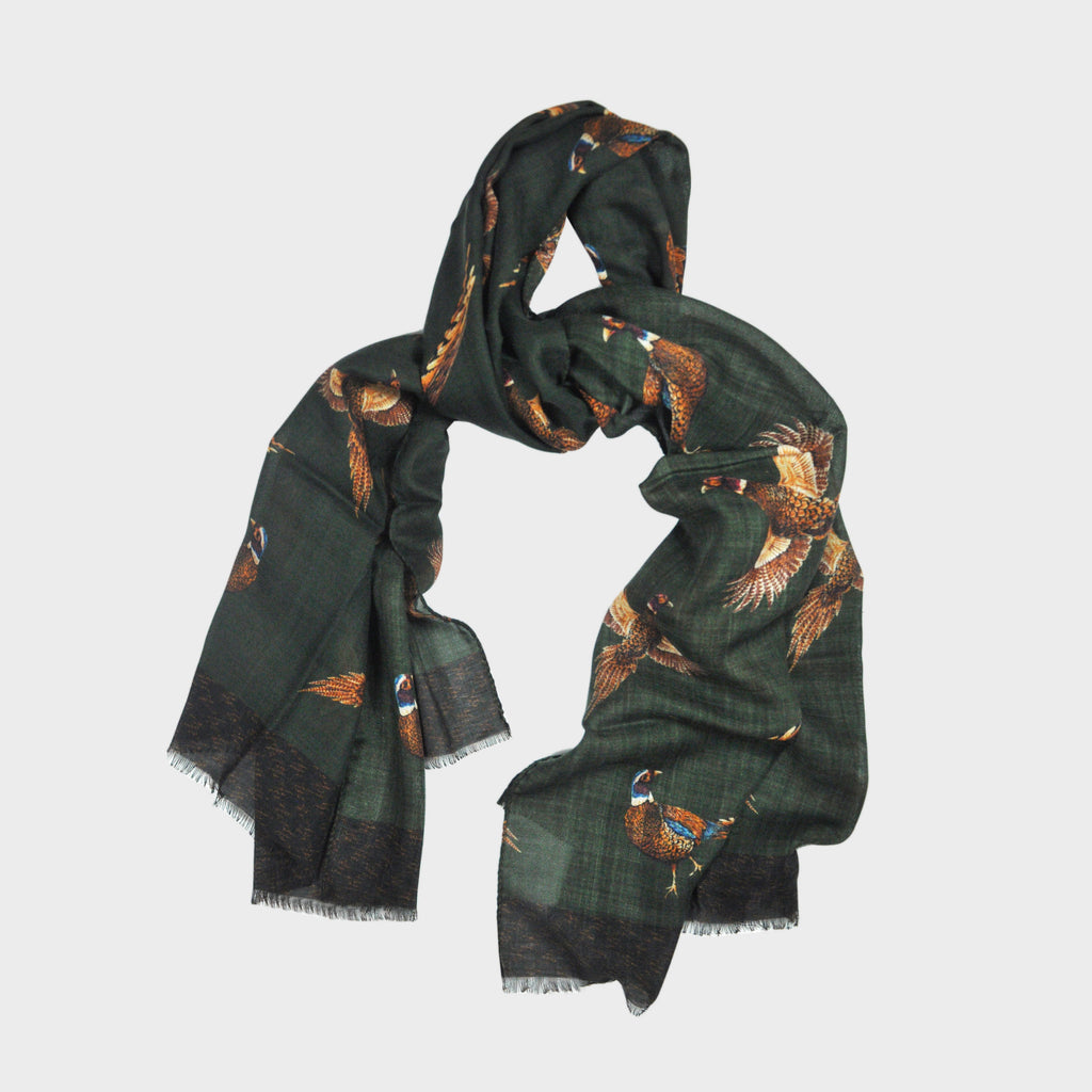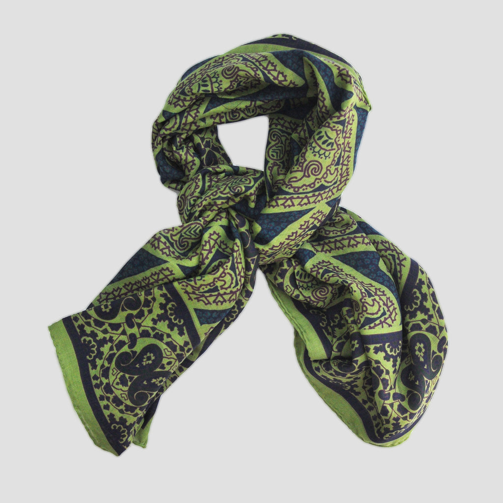 Wool Silk Paisley Scarf in Green, Ochre & Blue