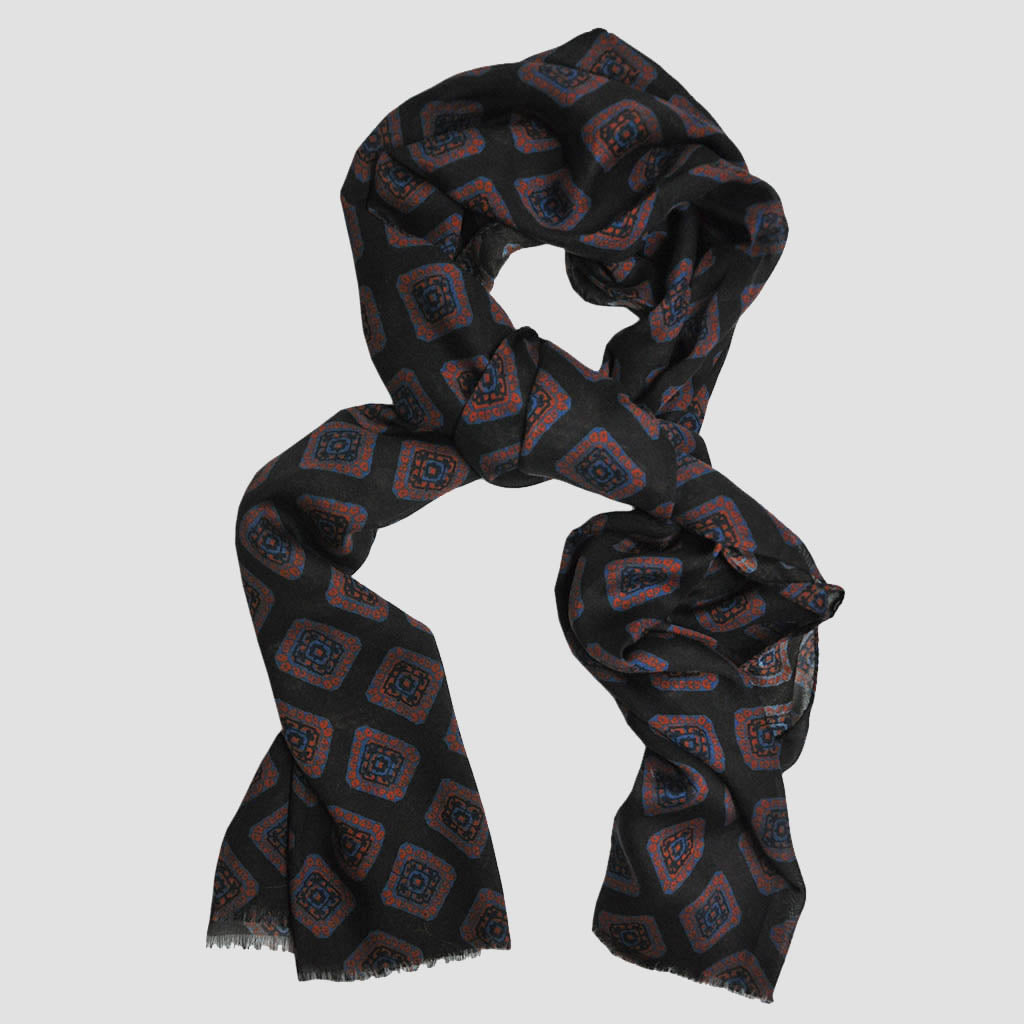 Wool Silk Medallion Scarf in Brown, Blue & Red