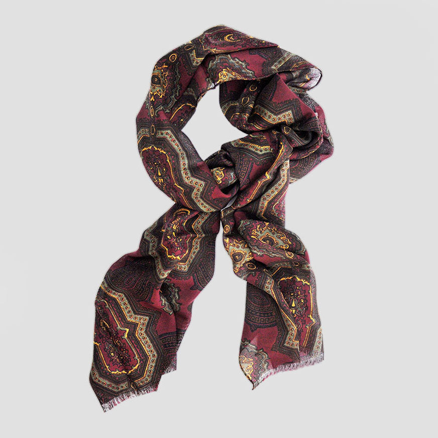 Wool Silk Medallion Scarf in Claret & Brown