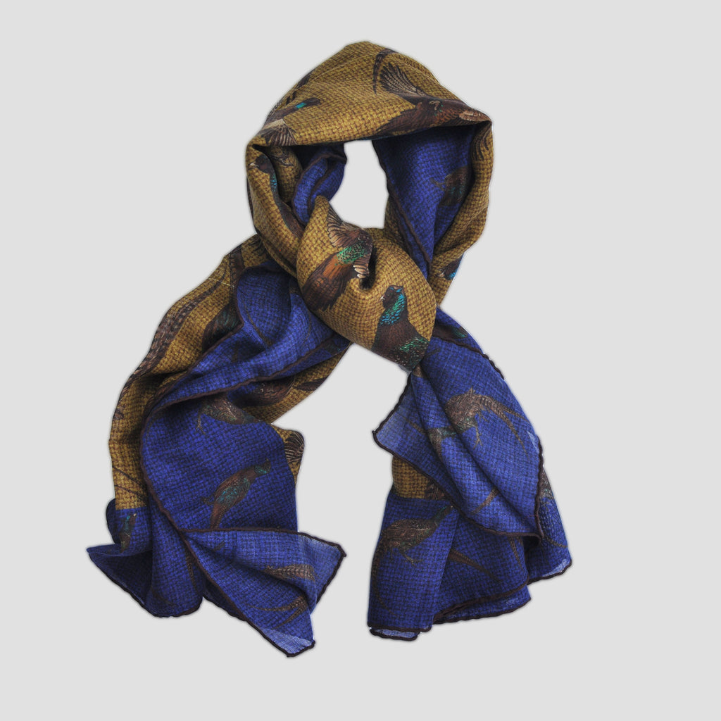 Wool Silk Pheasant Large Square in Blue, Ochre & Brown