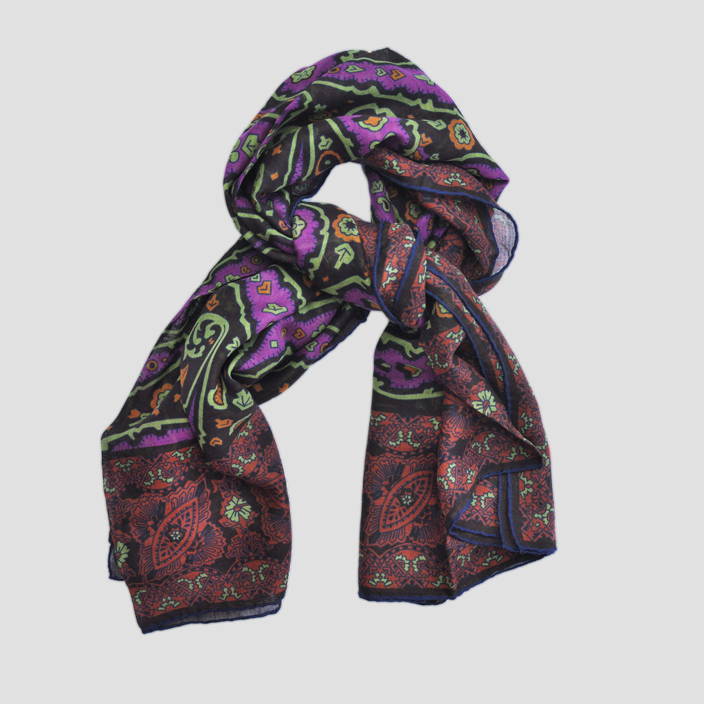 Wool Silk Paisley Scarf in Blue, Purple & Ochre