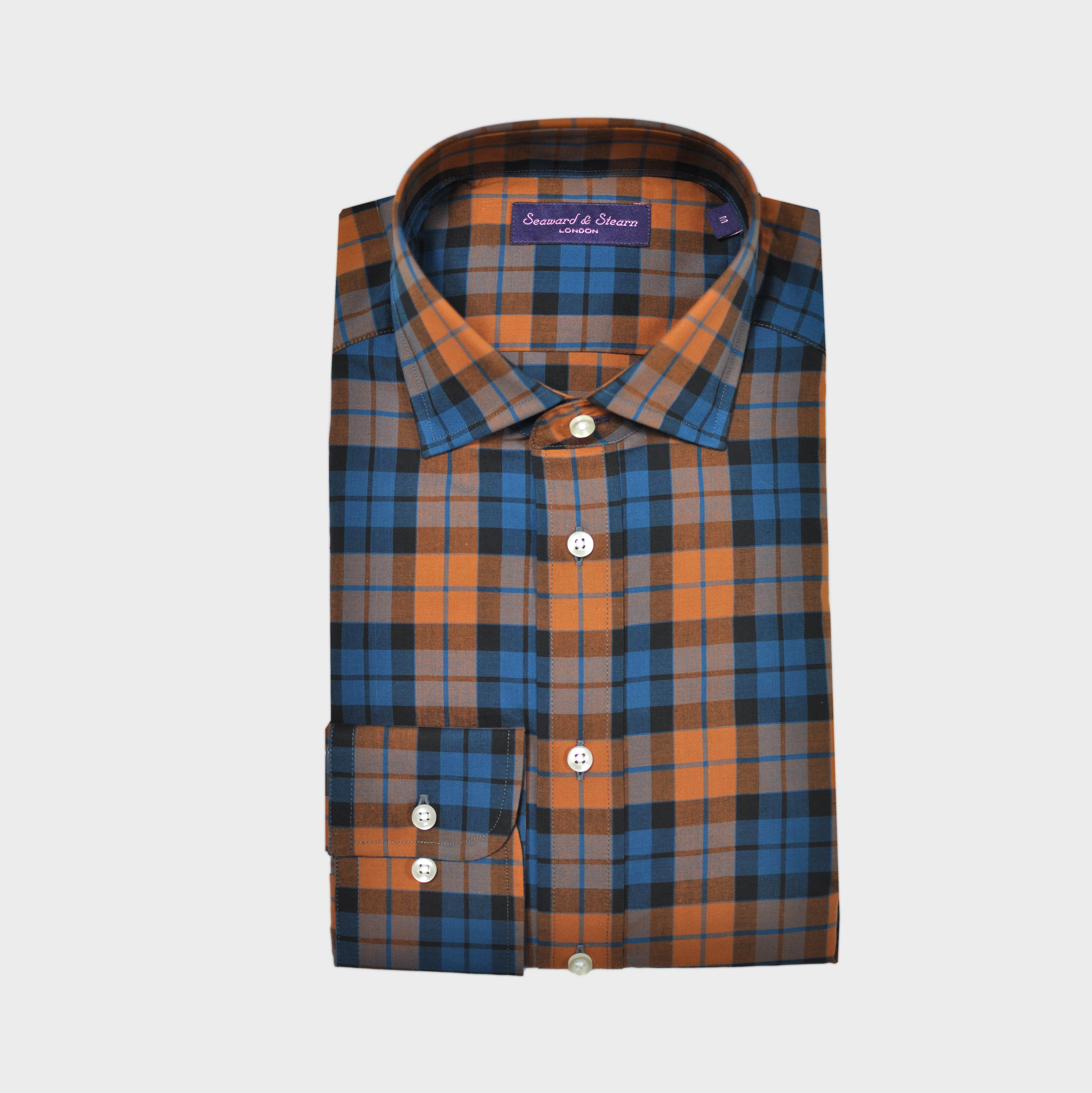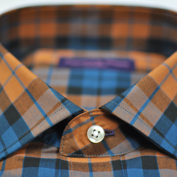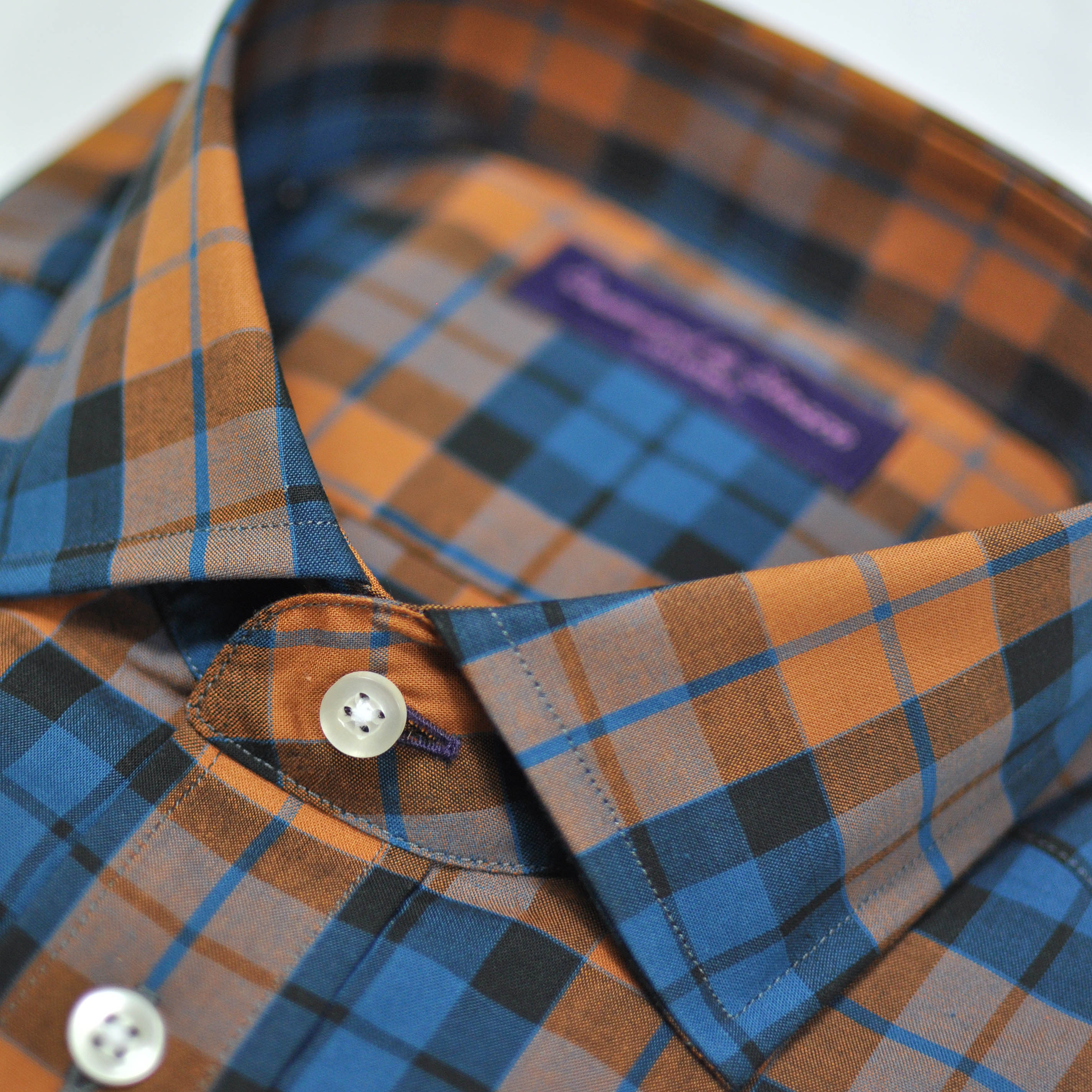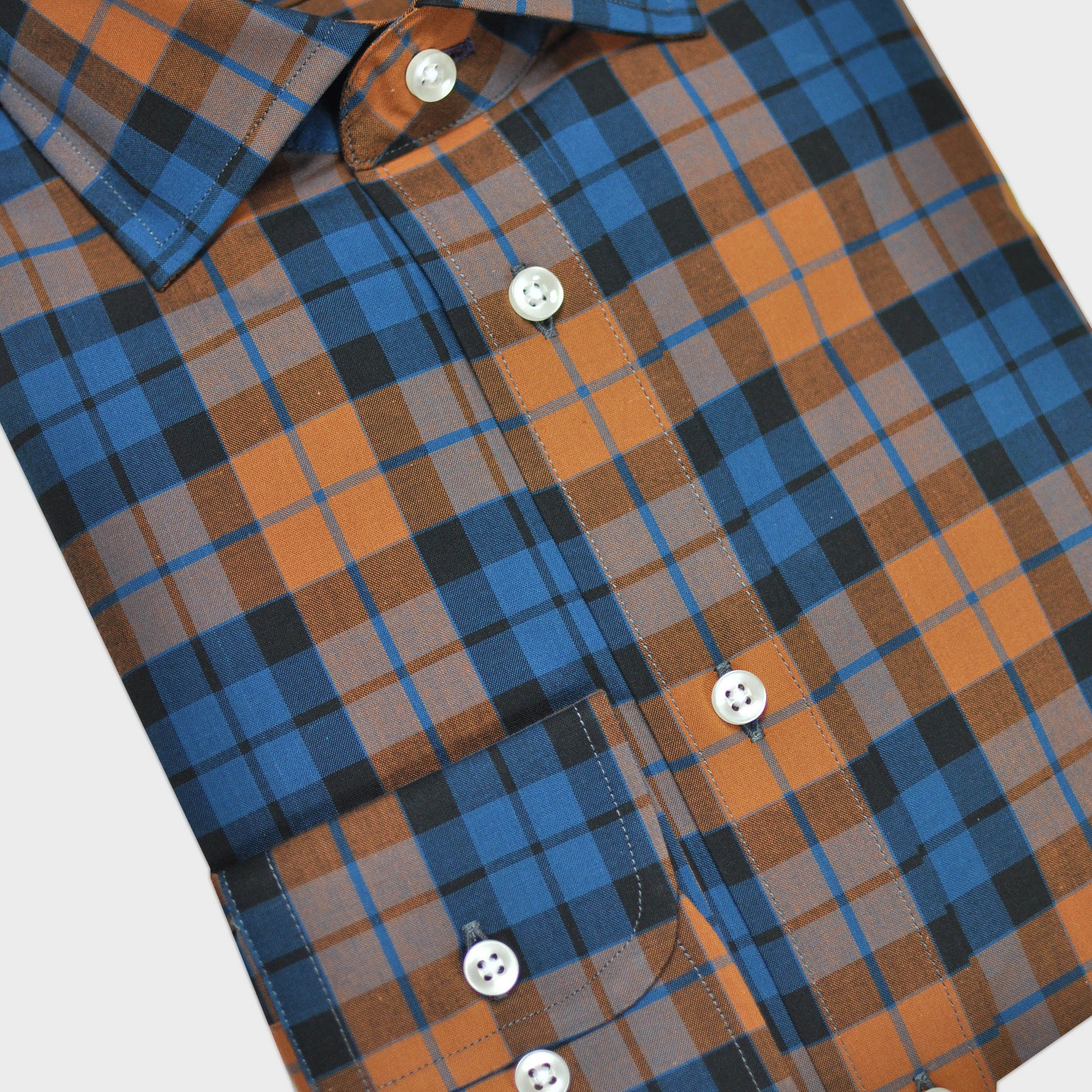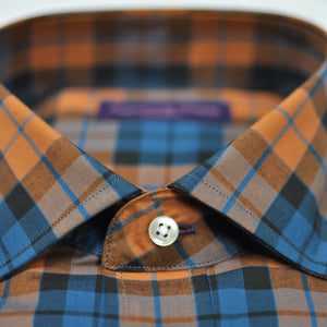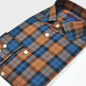 Plaid Spread Collar Sports Shirt in Ochre & Blue