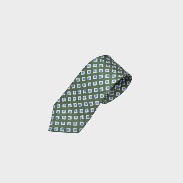 Little Repeat Geo's Silk & Linen Tie in Olive Green, Blue & White