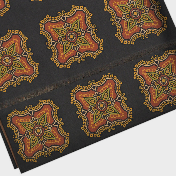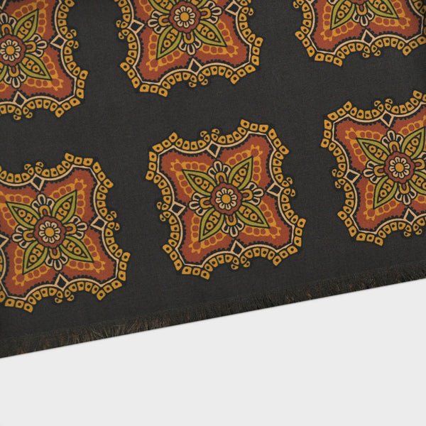 Big Medallions Madder Silk Fringed Scarf with Wool Lining in Browns & Ochre