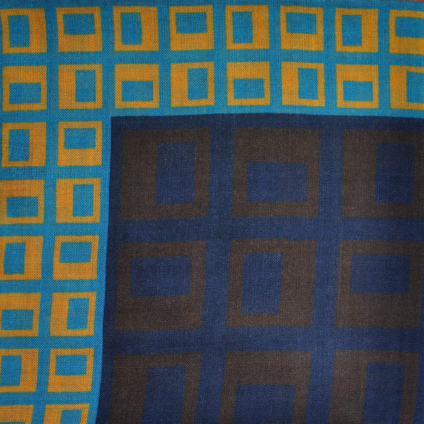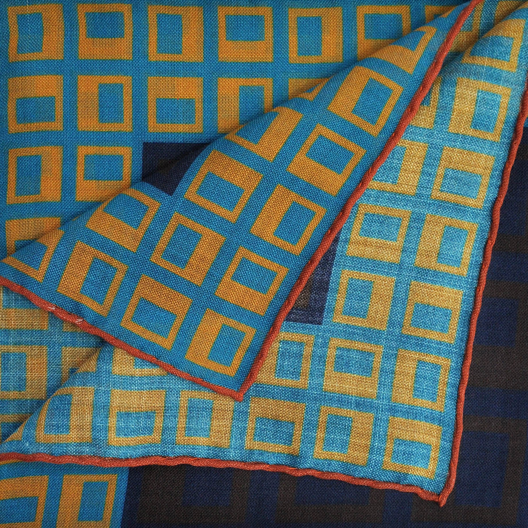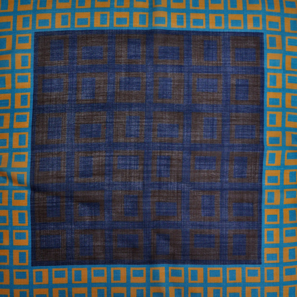 Geometric Squares Wool & Silk Pocket Square in Navy, Brown, Teal & Ochre