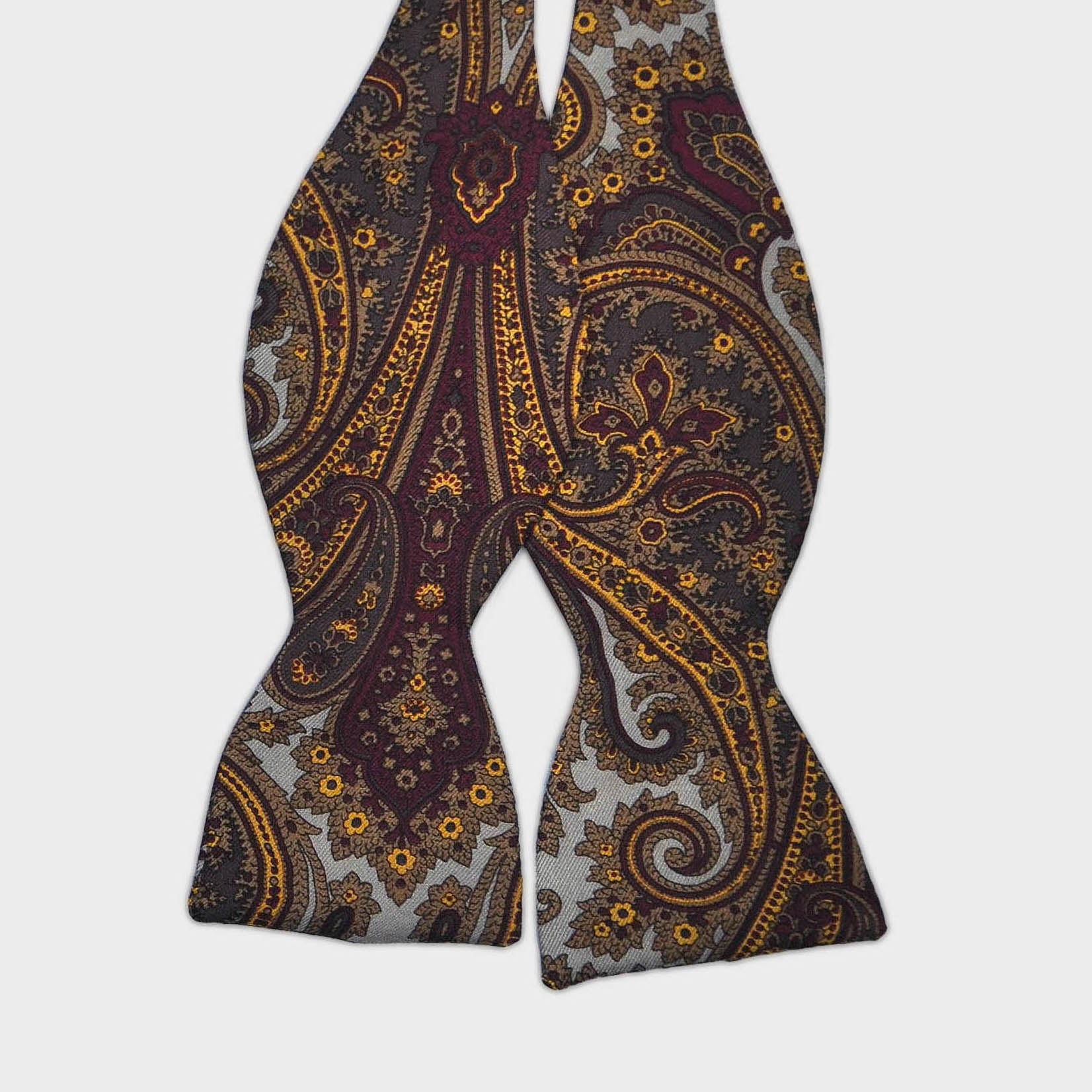 English Printed Silk Paisley Bow Tie in Claret, Ochre & Blue Grey